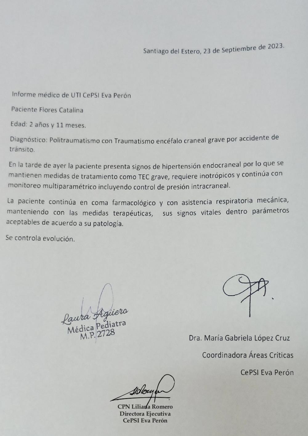 Este sábado 23 de septiembre, desde el Centro Provincial de Salud Infantil, difundieron un nuevo parte médico de Catalina Flores, hija del cantante Huguito Flores y única sobreviviente de la tragedia que culminó con la vida del artista santiagueño, su pareja y su cuñado.