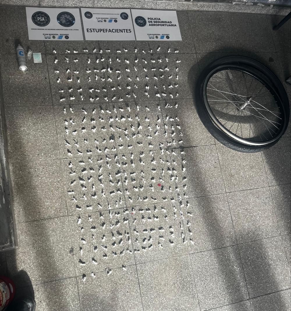 Policía de Seguridad Aeroportuaria (PSA) detuvo a un hombre y secuestró 94,2 gramos de cocaína ocultos en una cubierta de bicicleta. El operativo tuvo lugar en la ciudad de Rosario, provincia de Santa Fe.