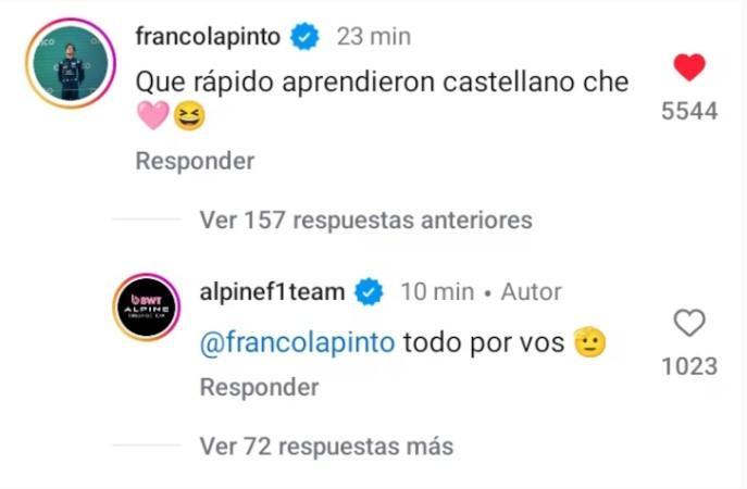 Incluso, en una nueva muestra del impacto de la llegada de Franco es que hicieron un texto en español, lo que despertó la sorpresa de los usuarios y el propio Colapinto hizo un comentario al respecto: "Qué rápido aprendieron castellano, che". Y la escudería respondió: "Todo por vos".