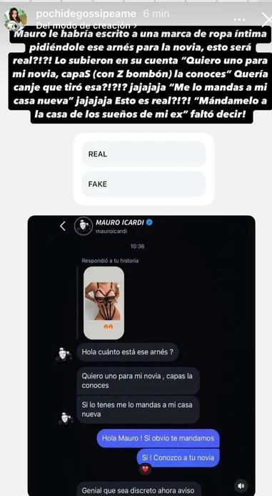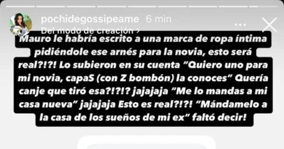 "Mauro le habría escrito a una marca de ropa íntima pidiéndole ese arnés para la novia, esto será real?!?! Lo subieron en su cuenta", reveló Pochi de Gossipeame, junto a una captura de pantalla.