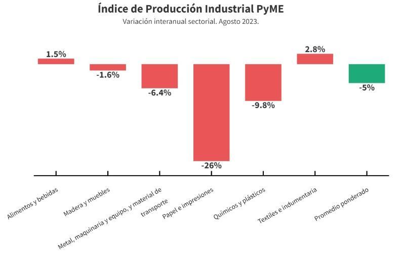 La industria manufacturera de pymes sufrió su tercer mes consecutivo de contracción en agosto, experimentando una caída del 5% en comparación con igual período del 2022. Si se examina el lapso acumulado entre enero y agosto de 2023, se evidencia una caída anual del 0,1%. Además, en la comparación mensual, también declinó un -0,9%.