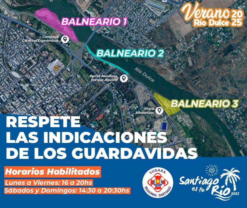 Esta temporada, se definieron tres balnearios: frente al predio de Ciencias Económicas; desde el puente de la autopista Santiago - La Banda hasta la calle de Mar del Plata y en un amplio sector de la Costanera a la altura de la Plaza Añoranzas.