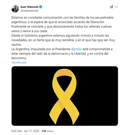 El embajador argentino en Israel, Axel Wahnish aseguró que: "Estamos en constante comunicación con las familias de los secuestrados argentinos, a la espera de que el anunciado acuerdo de liberación finalmente se concrete y que absolutamente todos los rehenes vuelvan sanos y salvos a sus casas", publicó el diplomático.