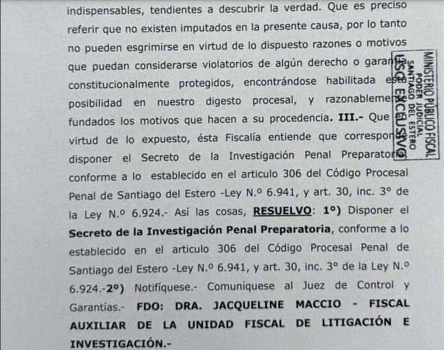 Según el entendimiento de la Fiscalía, "consideramos pertinente disponer el secreto de la investigación penal en curso. Es objeto primordial para éste Ministerio Público Fiscal arribar a la verdad, y conocer a ciencia cierta lo acontecido, y para ello es necesario adoptar esta medida, que, nos permitirá efectuar las diligencias pendientes e indispensables, tendientes a descubrir la verdad".