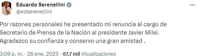Posteriormente, Serenellini utilizó sus redes sociales para confirmar su dimisión: "Por razones personales he presentado mi renuncia al cargo de Secretario de Prensa de la Nación al presidente Javier Milei".