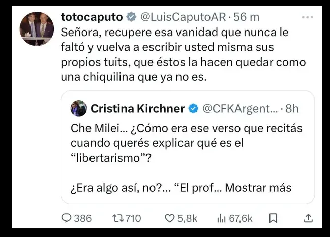 Tras esto, Luis Caputo se calzó los guantes y decidió responderle a la líder del kirchnerismo: "Señora, recupere esa vanidad que nunca le faltó y vuelva a escribir usted misma sus propios tuits, que éstos la hacer quedar como una chiquilina que ya no es", manifestó el ministro de Economía, con una chicana hacia la exmandataria respecto de que no fue ella quien escribió semejante mensaje.