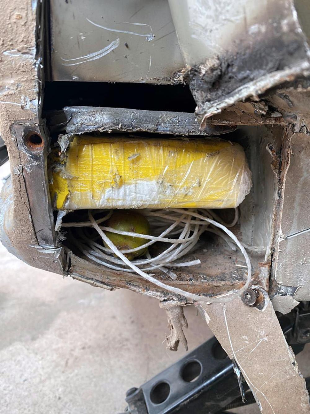 Ante esta situación, los efectivos utilizaron un escáner móvil de la fuerza, el cual reveló la presencia de una caja metálica oculta en la estructura del vehículo. Tras una inspección más detallada, se extrajeron 29 paquetes envueltos en material amarillo que contenían una sustancia que, tras la prueba de campo narcotest, dio positivo para cocaína, con un peso total de 28 kilos 697 gramos.