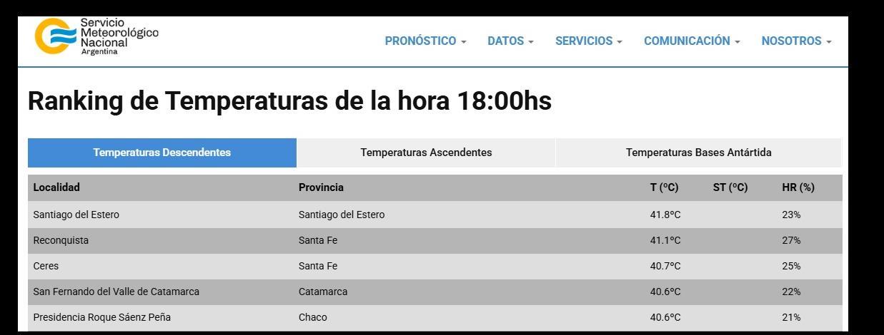 La ciudad de Santiago del Estero se ubica en el primer lugar del ranking de las ciudades más calientes del país, según el Sistema Meteorológico Nacional (SMN). A las 18 horas de este martes, la temperatura en la ciudad alcanzó los 41,8ºC.
