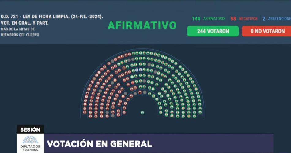 El proyecto de Ficha Limpia obtuvo media sanción en la Cámara de Diputados. Con 144 votos afirmativos, 98 negativos y dos abstenciones, el proyecto de Ficha Limpia fue aprobado en la Cámara baja y ahora pasará al Senado.