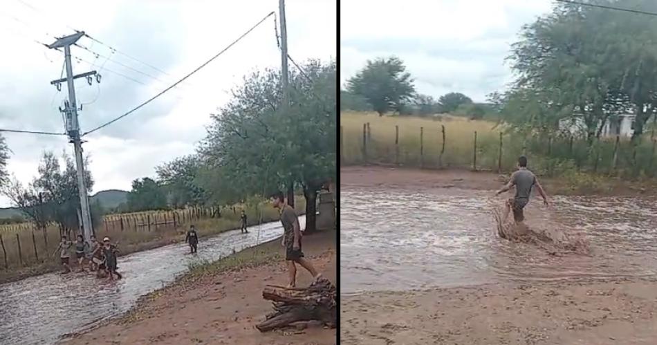 Las imágenes muestran los caminos que conectan El Rodeo con la localidad de San Justo completamente anegados, cubiertos de agua y barro. En la grabación, un grupo de jóvenes camina por la zona afectada, evidenciando lo provocado por la intensa tormenta.