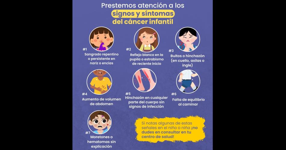 "Presta atención a estas señales: mancha blanca en el ojo, estrabismo o pérdida visual; palidez, moretones o sangrado sin causa aparente; dolor de cabeza persistente o vómitos matutinos; dolor continuo en huesos o articulaciones; bultos o hinchazón en cuello, axilas o ingle sin signos de infección; hinchazón abdominal o pérdida de peso inexplicable", difundieron.