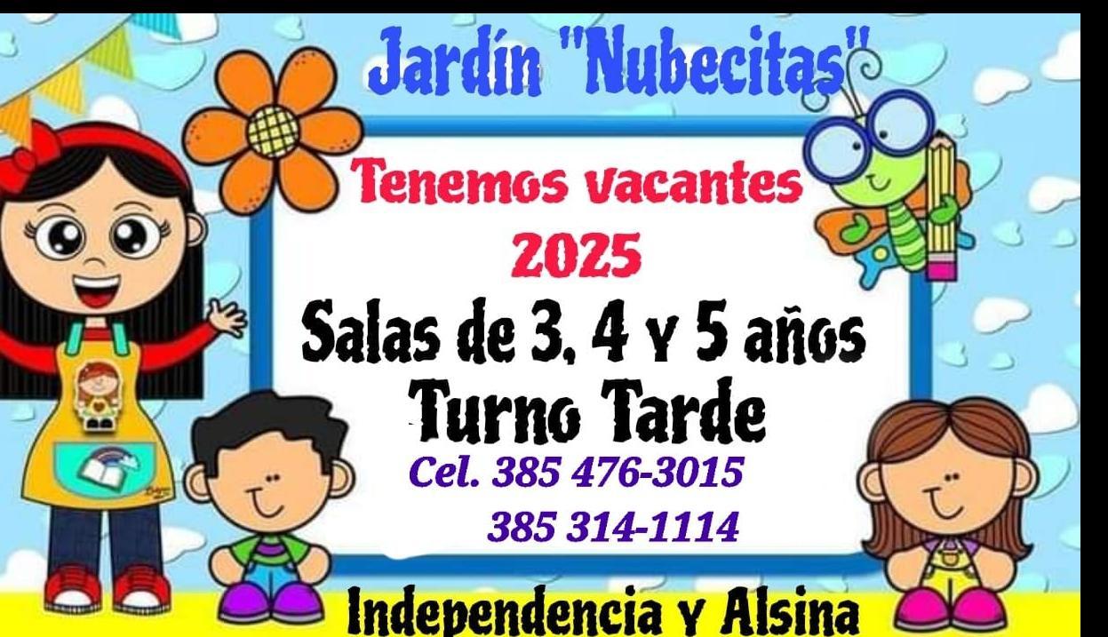 El Jardín N°26 "Nubecitas", ubicado en calle Independencia y Alsina de la ciudad Capital, informa a la comunidad santiagueña que hay vacantes para este ciclo lectivo 2025.