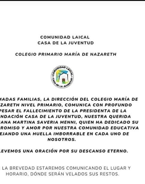 Con profundo dolor, Santiago llora la muerte de la hermana Saveria Menni. La reconocida y admirable religiosa, falleció en horas de esta siesta, en un centro asistencial de la ciudad Capital, debido a una dolencia que la mantuvo internada por varios días.