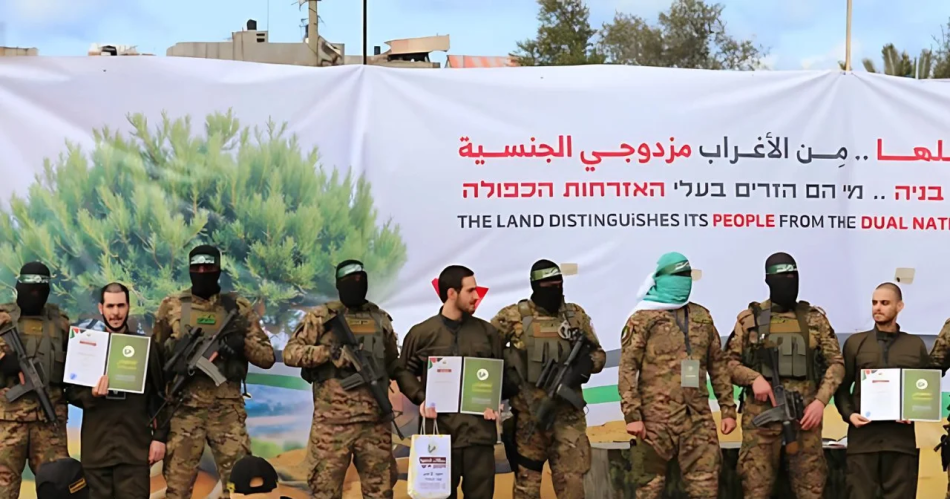 Tres de los liberados, Eliya Cohen, Omer Shem Tov y Omer Wenkert, fueron trasladados por hombres armados y encapuchados a un escenario en Nuseirat, en el centro de Gaza, donde fueron exhibidos ante una multitud antes de ser escoltados hasta los vehículos del CICR.