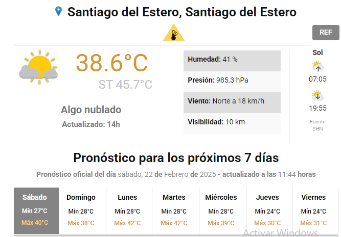 Tal como ese anticipaba, Santiago del Estero vive hoy una jornada infernal. Aunque el Servicio Meteorológico Nacional anuncia para hoy 40° de temperatura real máxima, a las 14, la sensación térmica ya casi alcanzaba los 46°.