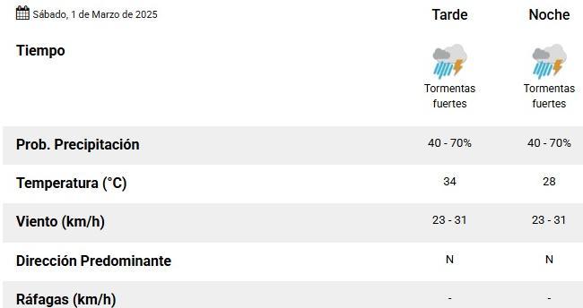 Tarde: Tormentas fuertes y calor intenso, con una máxima de 34°C.