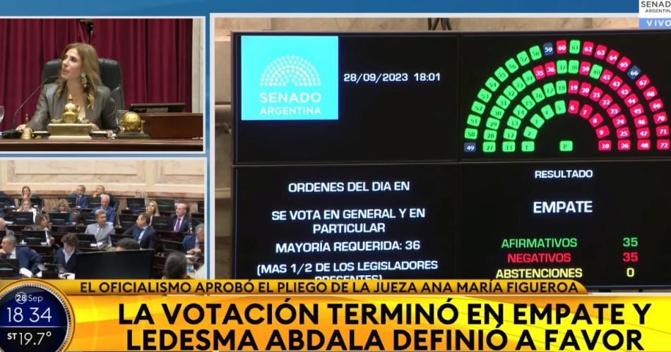 Tras un empate, definido a favor por la presidenta provisional del Senado, Claudia Ledesma Abdala de Zamora, el oficialismo en el Senado consiguió este jueves aprobar una serie de pliegos judiciales, entre los que se destaca el de la jueza Ana María Figueroa, quien cumplió 75 años de edad el 9 de agosto pasado, por lo que la Corte Suprema de Justicia dispuso el 6 de septiembre que deje el cargo.