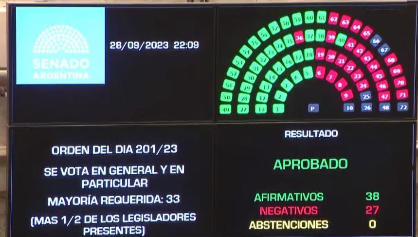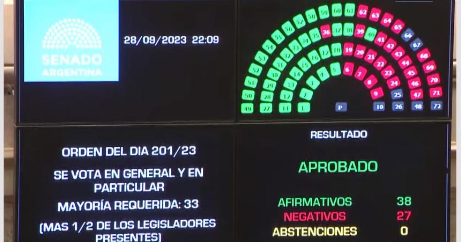 La iniciativa, aprobada la semana pasada en Diputados, obtuvo en la Cámara alta 38 votos positivos, de los 31 senadores del interbloque oficialista; los aliados Alberto Weretilneck (Juntos Somos Río Negro), Magdalena Solari Quintana (Misiones) y Clara Vega (Hay Futuro Argentina); y los legisladores de Unidad Federal Guillermo Snopek, Edgardo Kueider, Carlos "Camau" Espínola y María Eugenia Catalfamo, exmiembros del Frente de Todos.