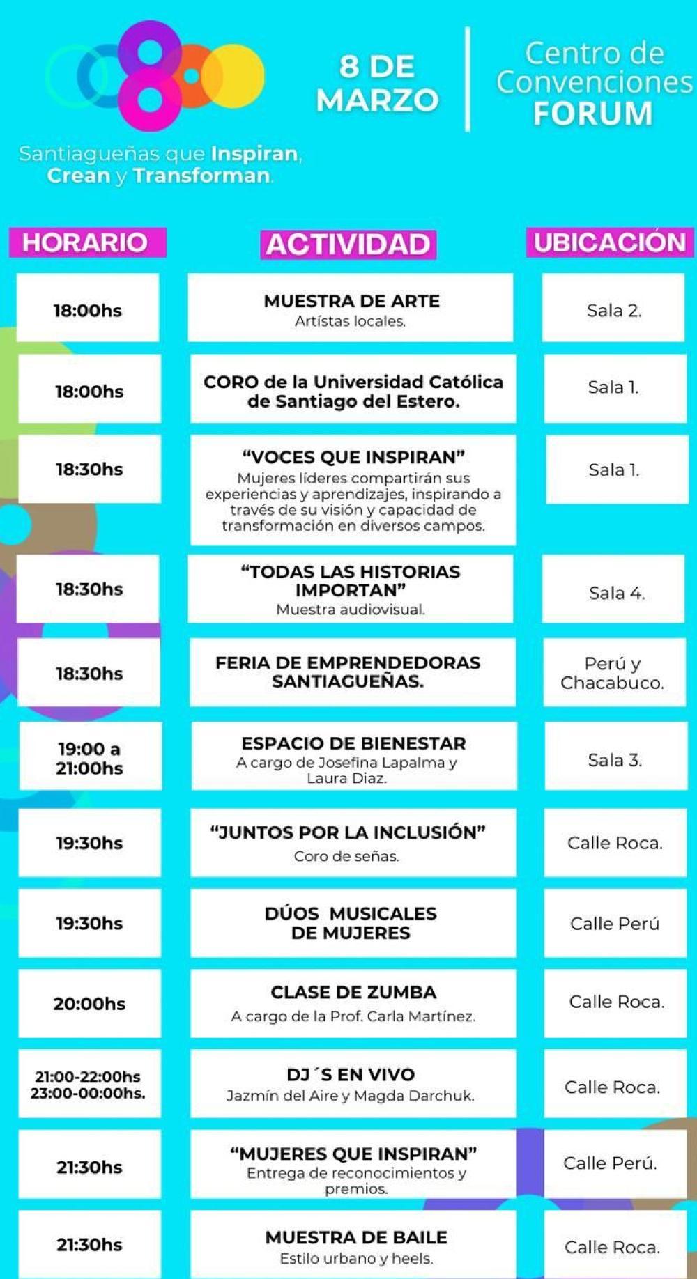 Habrá stands de instituciones de la provincia y asociaciones de la sociedad civil. Además, una exposición artística con obras de mujeres locales y reconocimientos a "Mujeres que inspiran" con entrega de distinciones a figuras destacadas de la provincia por su labor y dedicación, en los distintos ámbitos.