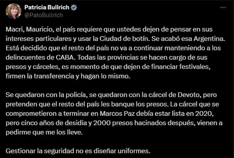 "Macri, Mauricio, el país necesita que dejen de pensar en sus intereses particulares y dejar de usar la Ciudad como botín. Esa Argentina se acabó", expresó Bullrich en su cuenta de X (ex Twitter), dejando claro su distanciamiento político con el exmandatario. Además, remarcó que todas las provincias se encargan de sus presos y cárceles, por lo que la Ciudad debería hacer lo mismo.
