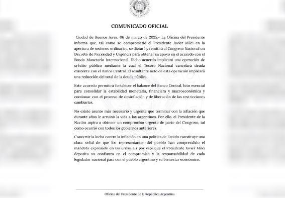 El comunicado destaca que "no existe asunto más necesario y urgente que terminar con la inflación", la cual, según el gobierno, ha "arruinado la vida de los argentinos". Por este motivo, Milei solicitó un "compromiso urgente" del Congreso para respaldar el acuerdo, al igual que hicieron "todos los gobiernos anteriores" en situaciones similares.
