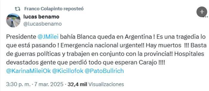 El piloto de Fórmula 1 compartió un tuit del coach que lo acompañó durante gran parte de su carrera, el bahiense Lucas Benamo."Presidente @JMilei, ¡Bahía Blanca queda en Argentina! ¡Es una tragedia lo que está sucediendo! ¡Emergencia nacional urgente! ¡Hay muertos! ¡Basta de guerras políticas y trabajen en conjunto con la provincia! ¡Hospitales devastados, gente que perdió todo, ¿qué esperan, carajo?", expresó Benamo en su cuenta de X.