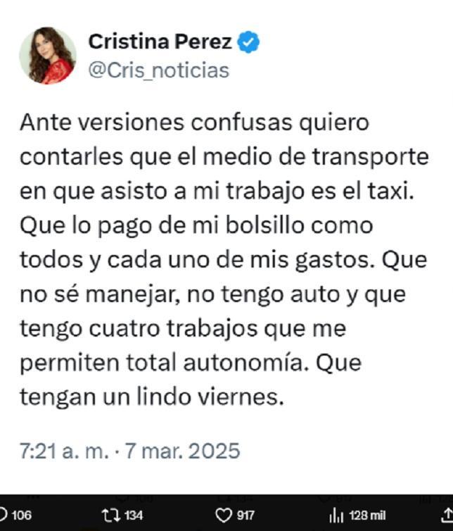 Por su parte la periodista se manifestó a través de su cuenta oficial de X dejando en claro lo siguiente: "Ante versiones confusas quiero contarles que el medio de transporte en que asisto a mi trabajo es el taxi. Que lo pago de mi bolsillo como todos y cada uno de mis gastos.Que no sé manejar, no tengo auto y que tengo cuatro trabajos que me pemiten total autonomía", señaló y para finalizar: "Que tengan un lindo viernes".
