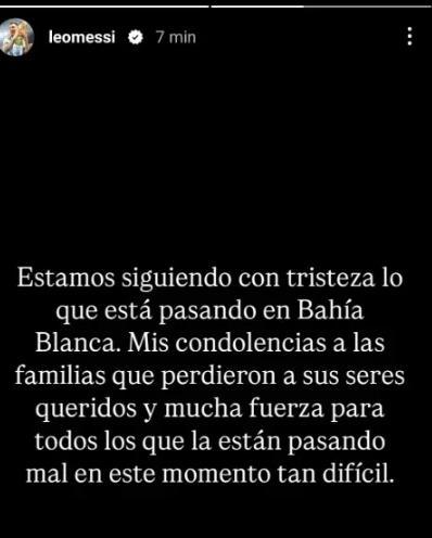 "Estamos siguiendo con tristeza lo que está pasando en Bahía Blanca. Mis condolencias a las familias que perdieron a sus seres queridos y mucha fuerza para los que la están pasando mal en este momento tan difícil", escribió el 10.