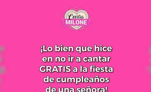 Atenta al programa, la actriz respondió desde Instagram: "Lo bien que hice en no ir a cantar gratis a la fiesta de cumpleaños de una señora". Una de las primeras en leer el posteo fue Moria Casán, que le escribió "¿Qué?", a lo que Milone respondió: "Venganza... ¡Que me veía venir! No le canté en el cumple, no le fui al primer programa, y hoy me hizo destrucción total... cuando sabe perfectamente que yo no instalé la noticia. Ella sabe quién arrancó a hablar. Lo sabe ella y su descendencia... En fin, nada que me sorprenda ya".