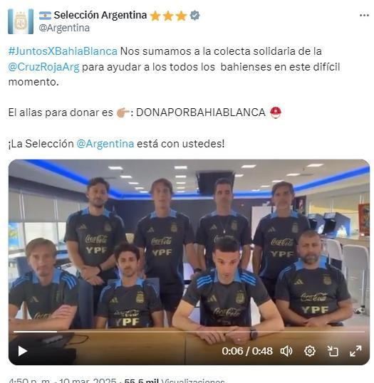 Junto al video, la cuenta de X del equipo Albiceleste compartió el hashtag "JuntoXBahíaBlanca" y el alias para donar: DONAPORBAHIABLANCA. Finalmente, añadieron: "¡La Selección Argentina está con ustedes!"