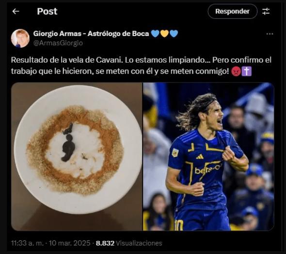 "Es el resultado de la vela de Cavani. Lo estamos limpiando... Pero confirmo el trabajo que le hicieron, se meten con él y se meten conmigo", escribió Armas en su cuenta de X. El mensaje iba acompañado de una imagen de la vela usada en el ritual y una foto del delantero uruguayo, quien no pasa por su mejor momento futbolístico.