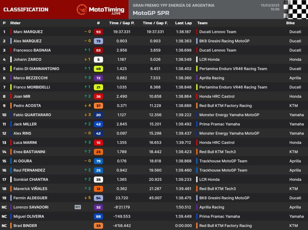 El mejor piloto fuera del dominio de Ducati fue Johann Zarco, con Honda, quien finalizó en la cuarta posición. Fabio Di Giannantonio, del equipo VR46, consiguió un meritorio sexto puesto. En tanto, Pedro Acosta, con KTM, comenzó a perder rendimiento en las últimas cinco vueltas y terminó cediendo posiciones.