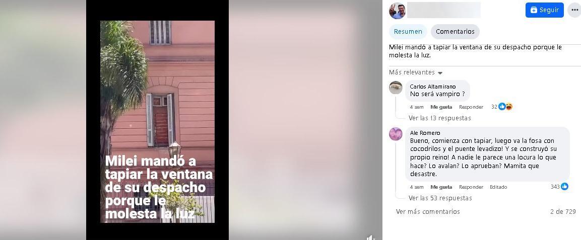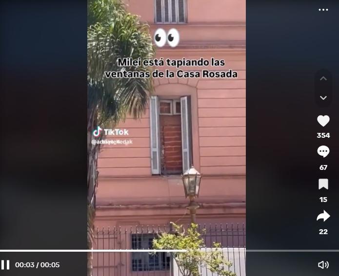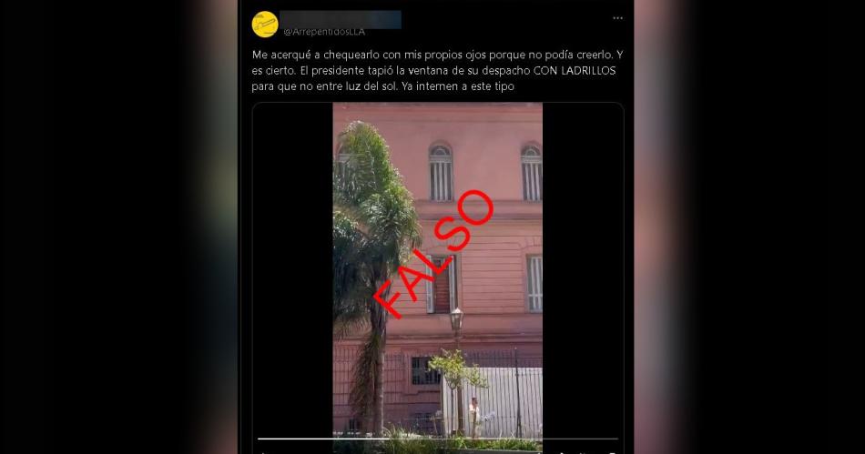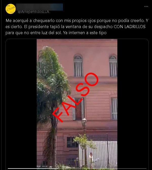 Circula en redes sociales circula en X, un video de Casa Rosada bajo el siguiente texto: "Me acerqué a chequearlo con mis propios ojos porque no podía creerlo. Y es cierto. El presidente tapió la ventana de su despacho con ladrillos para que no entre luz del sol. Ya internen a este tipo". Sin embargo, esto es falso: la ventana estaba tapiada desde antes de la asunción de Javier Milei.