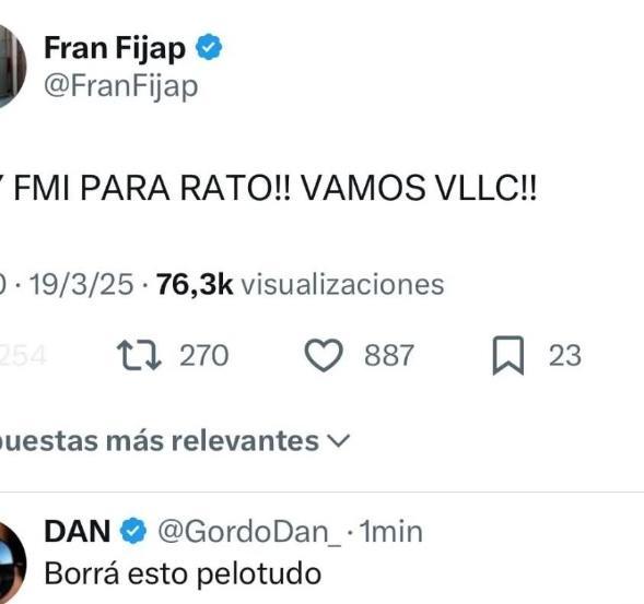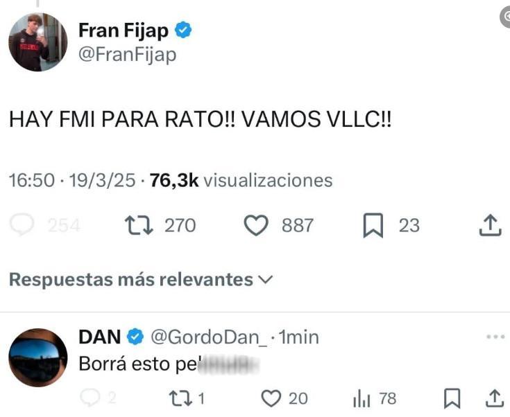 Tras la aprobación de un nuevo endeudamiento del país con el Fondo Monetario Internacional (FMI), seguidores del gobierno de Javier Milei se manifestaron a través de las redes sociales celebrando el "logro" en Cámara de Diputados, en este caso el influencer libertario Fran Fijap, se destacó expresando su alegría con un "Tuit" que luego tuvo que borrar por orden expresa de Daniel Parisini, mejor conocido como el Gordo Dan.