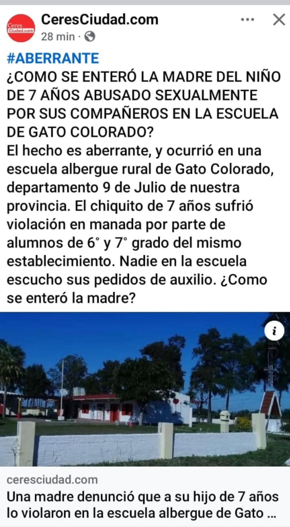 La madre de un alumno internado en la Escuela Albergue Conrado Nalé Roxlo N.º 1211- departamento 9 de Julio, Gato Colorado, Santa Fe, fue a esperar a su hijo el viernes último y lo encontró enajenado, abstraído y sumido en llantos sin poder explicar su trauma.