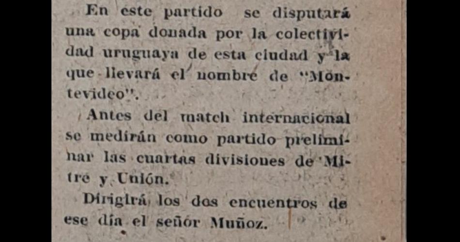 Es por ello la significación y la importancia de la concreción de este histórico enfrentamiento, que terminó de fundarse en el momento en el que quedó instituida la "Copa Montevideo", un trofeo de plata que fue donado por la colectividad uruguaya, que ponía en juego los honores y el prestigio del fútbol de nuestra provincia y el del pueblo oriental.