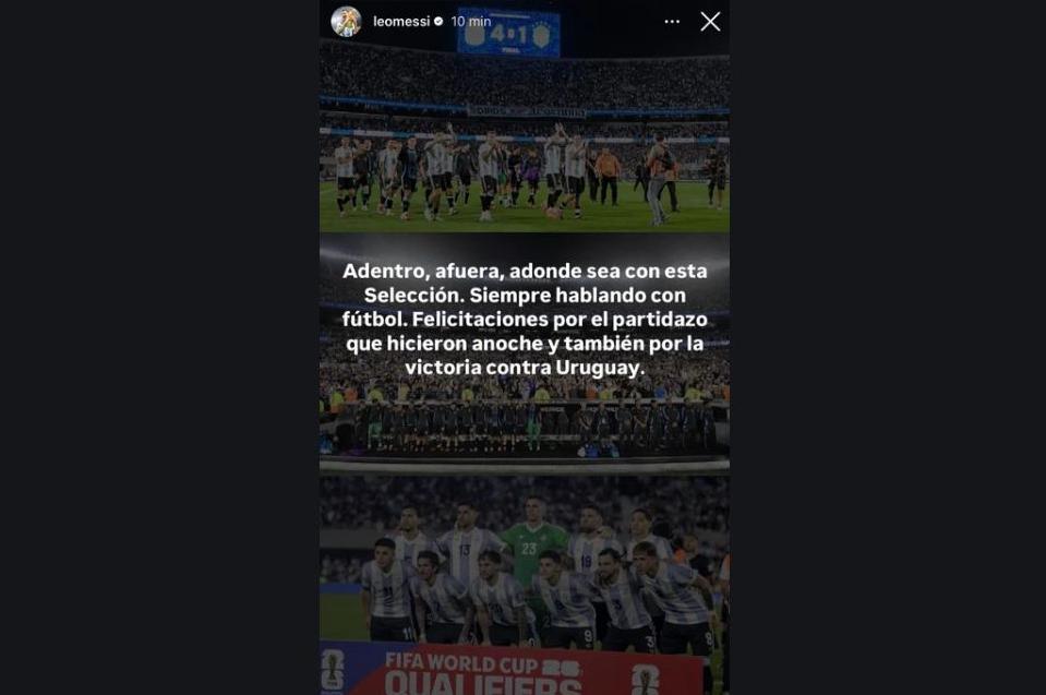 La "Pulga" compartió este miércoles por la mañana una historia de Instagram en la que destacó: "Adentro, afuera, a donde sea con esta Selección. Siempre hablando con fútbol". Además, aprovechó para felicitar a sus compañeros "por el partidazo que hicieron anoche y también por la victoria contra Uruguay".