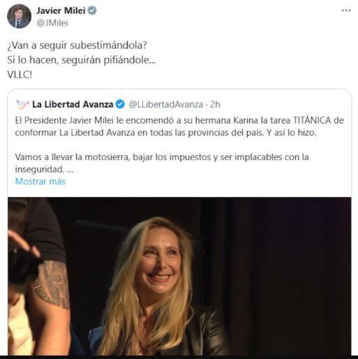 A través de las redes sociales de La Libertad Avanza, Milei compartió un video en el que resalta el trabajo de su hermana en la creación del partido en todo el país. "¿Van a seguir subestimándola? Si lo hacen, seguirán equivocándose", escribió el mandatario en su cuenta de X.