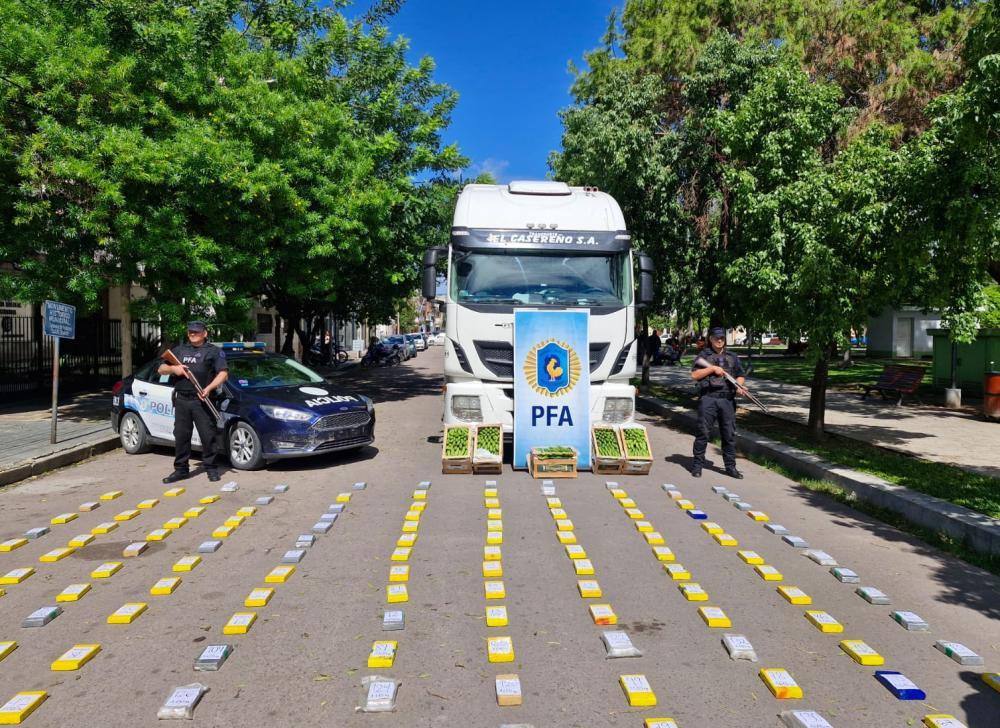 El procedimiento fue ejecutado el domingo a la noche y estuvo a cargo de efectivos de la Policía Federal y el juez, Guillermo Molinari, tras interceptarse un camión procedente de Orán, Salta, con destino a la provincia de Buenos Aires. Llevaba la droga camuflada en 400 cajones con limones y de bananas.