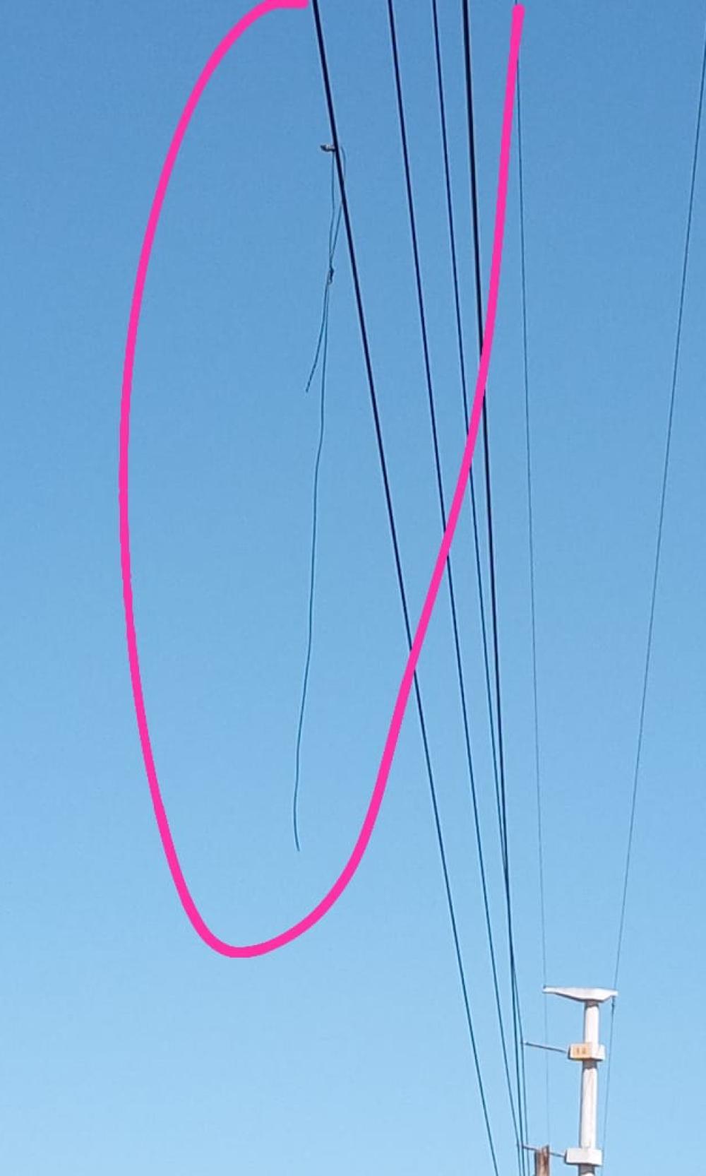 En efecto, personas inescrupulosas arrojaron una boleadora a los cables de la línea de alta tensión Oeste Fandet. Esta quedó enganchada en una posición peligrosa, lo que representa un serio riesgo para el sistema eléctrico.