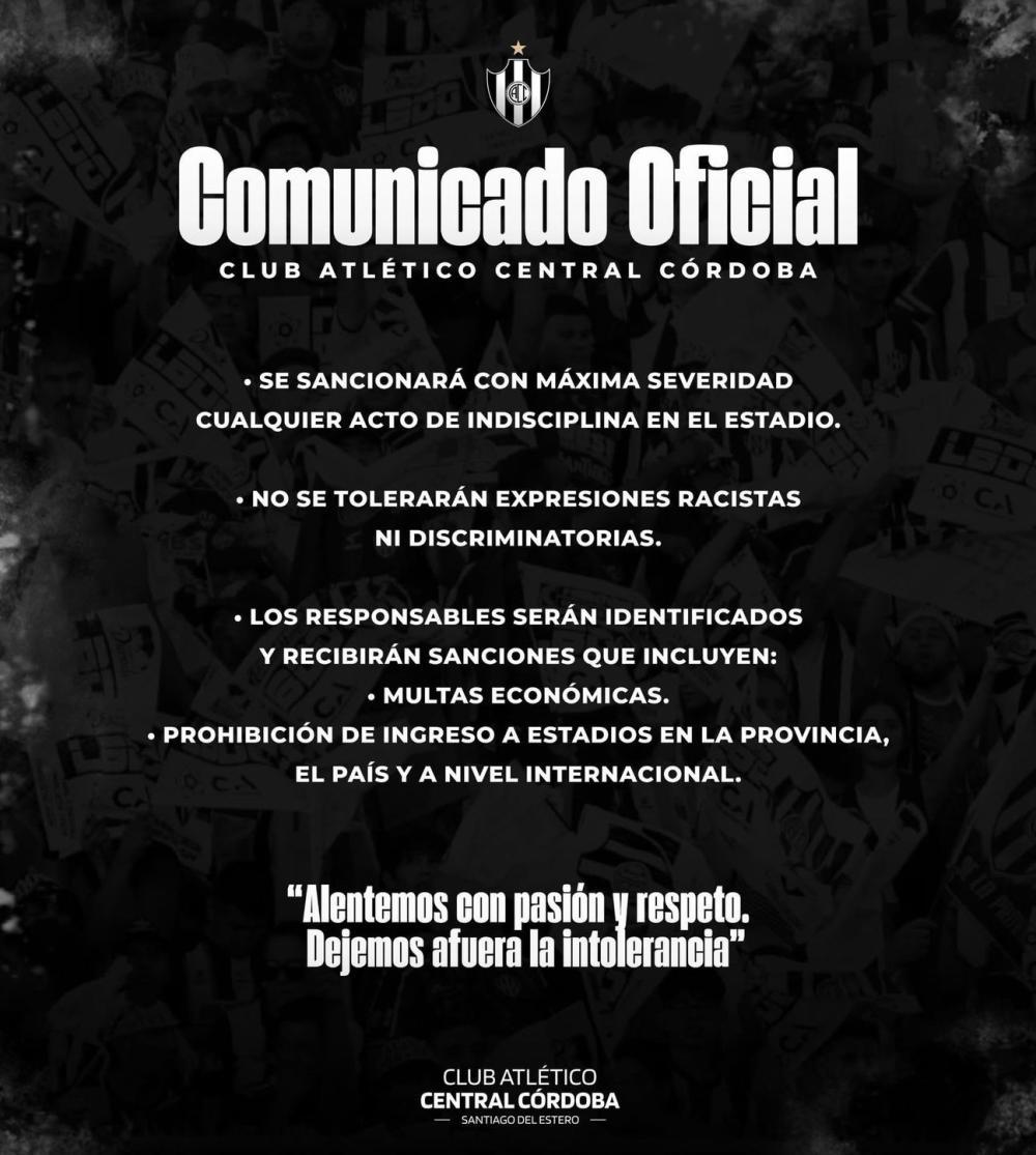"El fútbol es una pasión que nos une y nos representa. Por ello, no se tolerarán expresiones agraviantes, especialmente aquellas de contenido racista o discriminatorio. Quienes incurran en este tipo de actos serán identificados y recibirán sanciones de máxima severidad, incluyendo la responsabilidad por posibles multas económicas que el club pudiera afrontar, así como la prohibición de ingreso a cualquier estadio de la provincia, del país e incluso a nivel internacional", expresa el comunicado oficial.