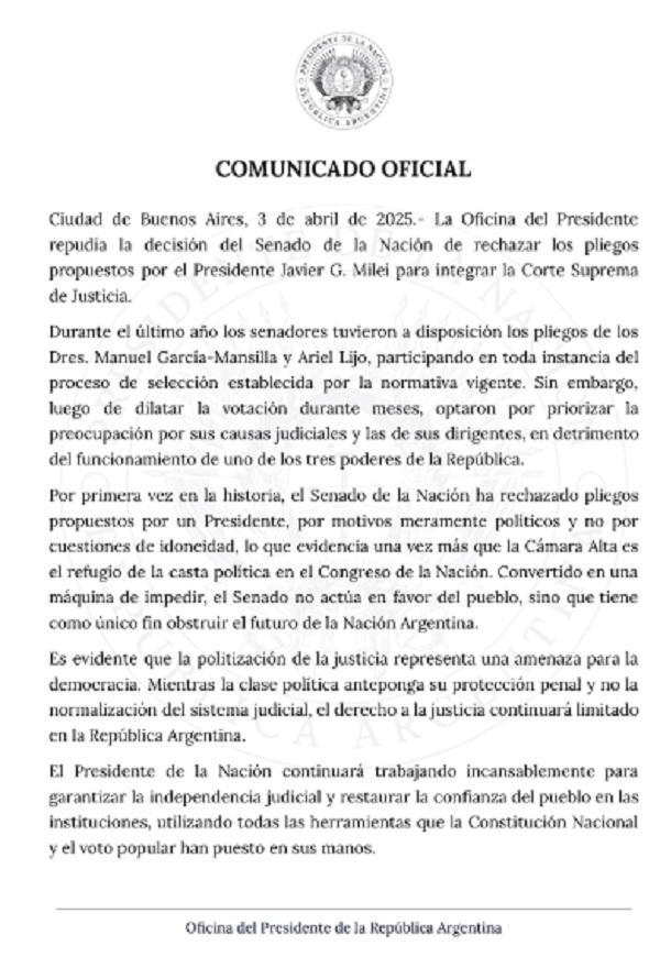 Lo hizo a través de X, con un comunicado de la cuenta de la Oficina del Presidente, detalla el portal de La Voz. En el escrito, llamaron el "refugio de la casta política" a la Cámara Alta y aseguraron que "la politización de la justicia representa una amenaza para la democracia".