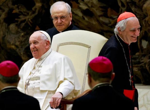 Francisco se ríe con el cardenal italiano Matteo Zuppi, presidente de la Conferencia Episcopal Italiana (REUTERS/Yara Nardi)
