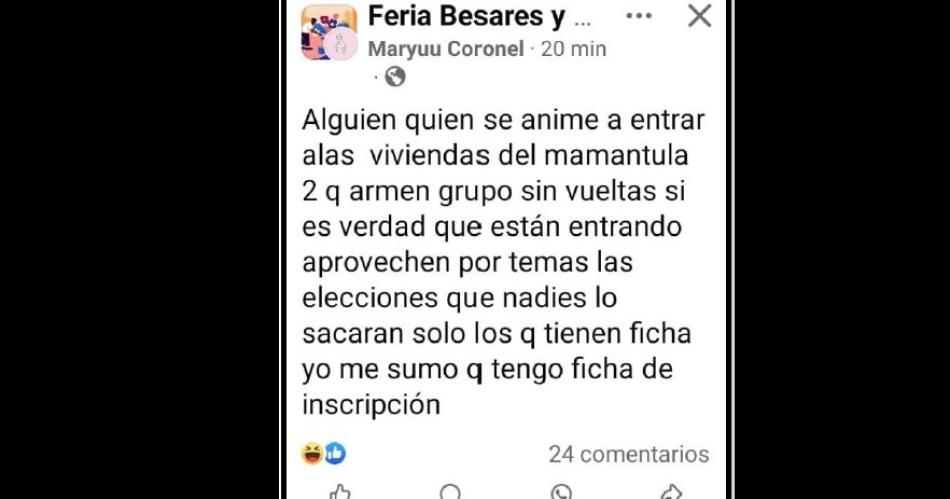 A raíz de las investigaciones digitales que la policía de Ciberseguridad realiza a diario, se descubrió que una mujer realizó un posteo en su cuenta de Facebook en el que decía: "alguien que se anime a entrar a las viviendas del Mama Antula".