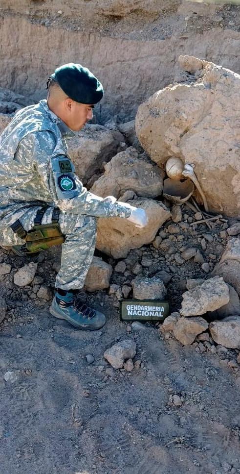En el segundo procedimiento, los efectivos del Escuadrón 25 "Jáchal" en la localidad sanjuanina de Bella Vista, realizaron una patrulla ambiental y con apoyo del Grupo Especialista en Alta Montaña (GEAM) hallaron restos óseos indígenas y material arqueológico.