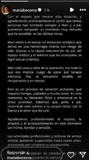 María continúa internada y en reposo, acompañada por su pareja, el cantante Juli, quien también canceló sus compromisos laborales para acompañarla. Desde su entorno destacan que atraviesa un proceso de sanación física y emocional, detalla el porta de Noticias Argentinas.