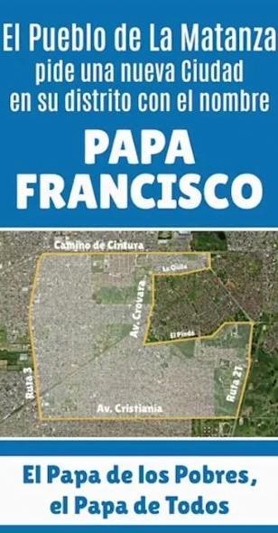 La idea nació tras una misa en homenaje a Francisco, oficiada el martes pasado por el monseñor Eduardo García, obispo de San Justo, en la Catedral local. En un primer momento, se propuso cambiar el nombre de la avenida Crovara. Luego, surgió la propuesta de unificar todos los barrios dentro de esos límites bajo el nombre "Ciudad Papa Francisco". "En el día de hoy, el Obispado de San Justo, junto a las comunidades de todas sus parroquias, realiza un tiempo de oración con un objetivo: que el nombre del Papa Francisco sea la identificación oficial de sus barrios más postergados", señalaron desde la diócesis.