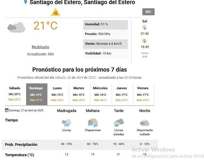 El Servicio Meteorológico Nacional pronostica para este sábado en Santiago del Estero, una jornada con lluvia y viento. Asimismo, emitió una alerta amarilla por ráfagas de hasta 70 km/h.