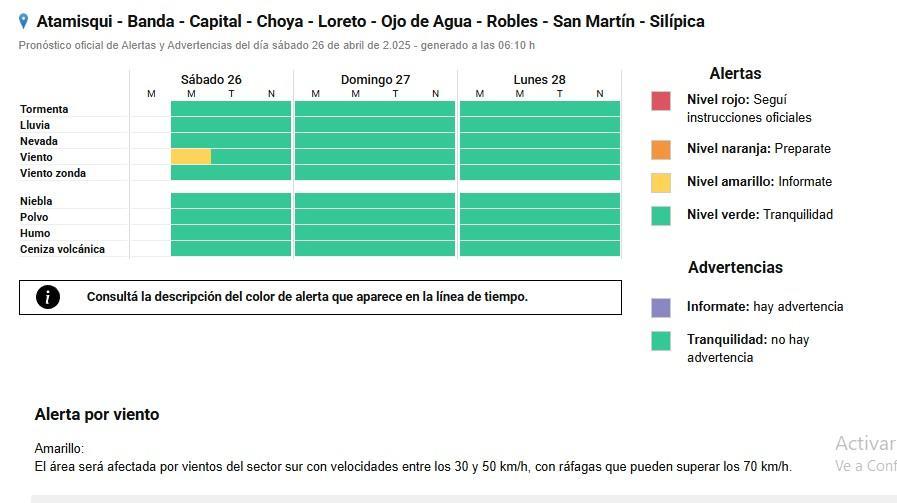 El SMN emitió una alerta amarilla para varias zonas del territorio santiagueño, por fuertes ráfagas de viento, que podrían superar los 70 km/h.
