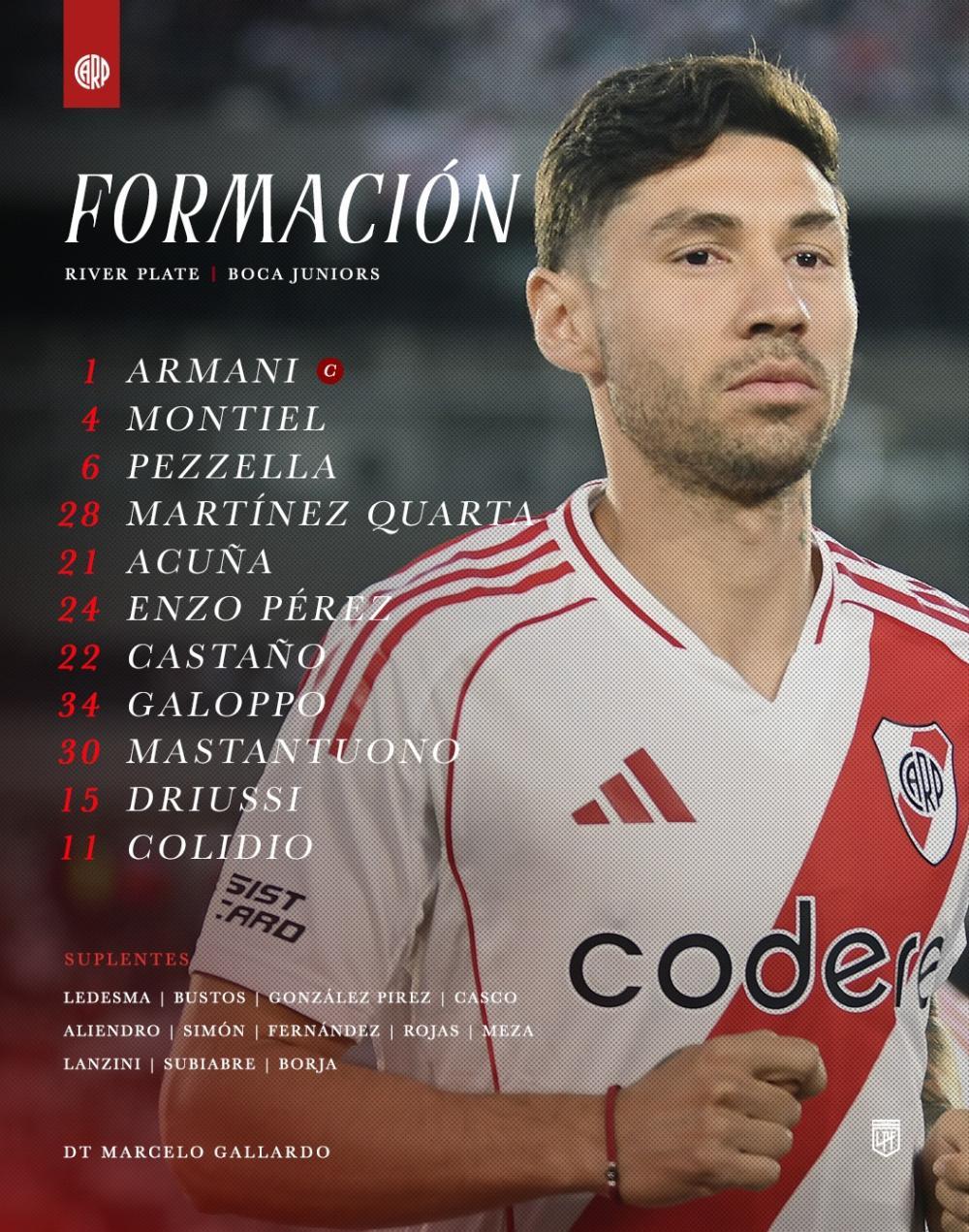 Franco Armani; Gonzalo Montiel, Germán Pezzella, Lucas Martínez Quarta, Marcos Acuña; Kevin Castaño, Enzo Pérez, Giuliano Galoppo; Franco Mastantuono; Facundo Colidio y Sebastián Driussi.